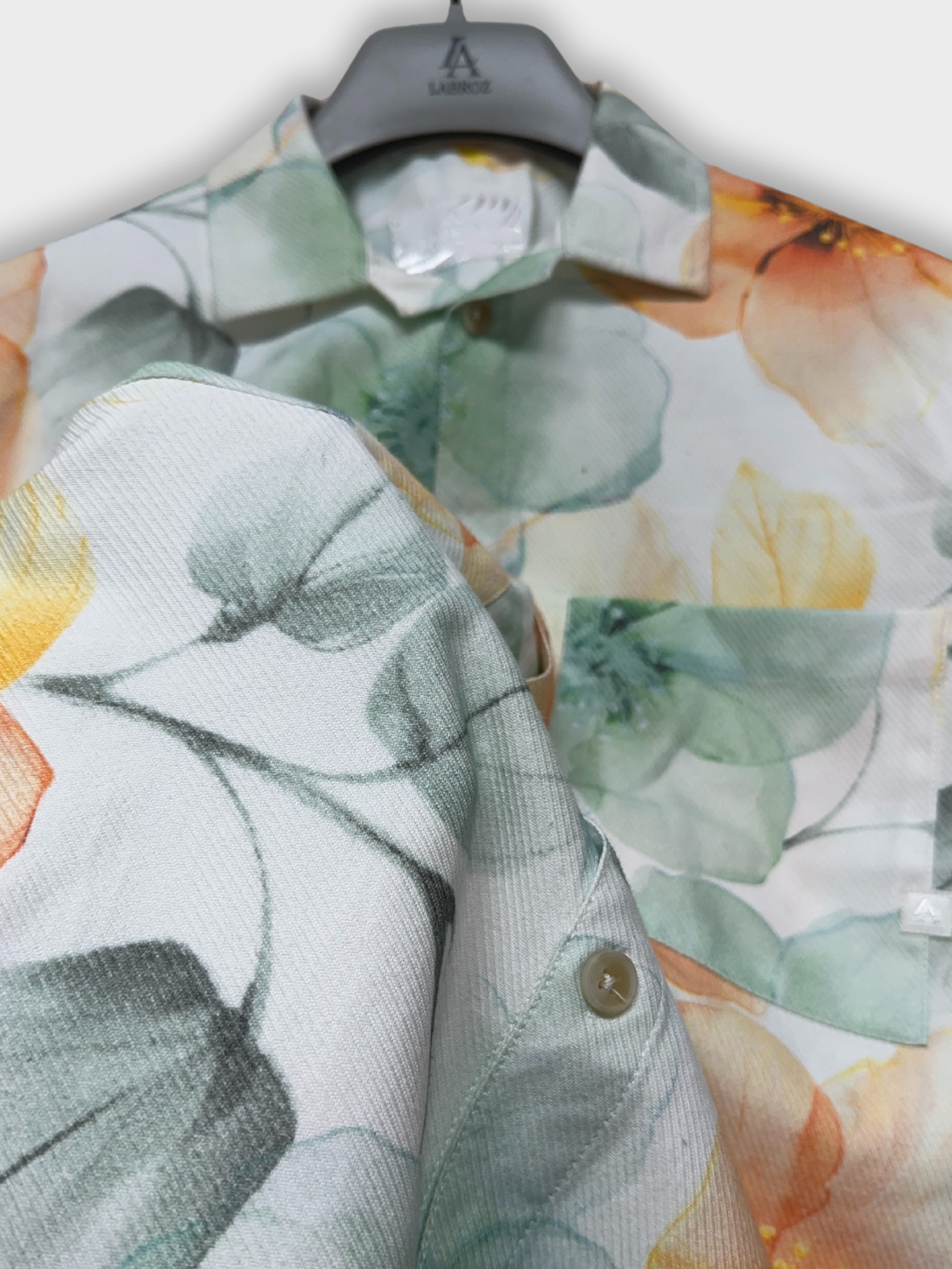 STYLE GUIDE: Make a bold, contemporary, and relaxed statement with our men's floral print heavy twill shirt. This piece is perfect for achieving an artistic, vacation-ready, and effortlessly cool look. Team it up with tailored shorts or light-colored chinos and white sneakers or espadrilles for an all-day vibrant and resort-ready appearance. Ideal for summer parties, tropical trips, or elevating your casual weekend style.